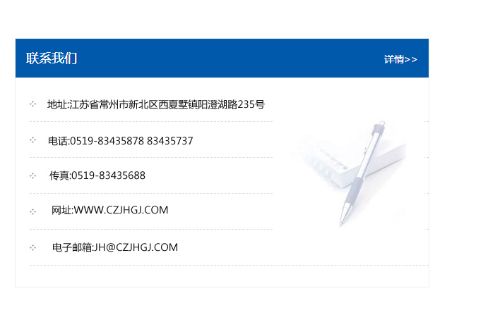 地址:常州市新北區(qū)友邦商務(wù)大廈1幢16、17層  電話:0519-85101652  傳真:0519-85112595  郵編:213022  網(wǎng)址:www.cz-jiayue_cn.youziyue.com  郵箱:xiajifengaa@163.com